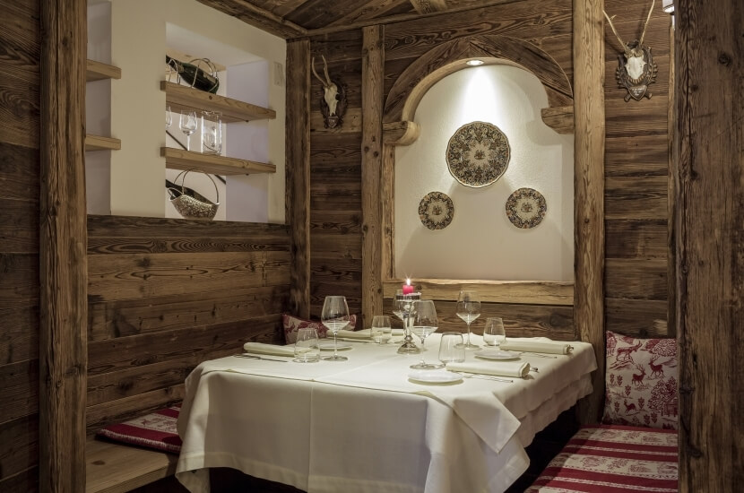 Eine gastronomische Welt, die man in einer stimmungsvollen Atmosphäre genießen kann. Der Hauptraum dreht sich um einen handverzierten Ölofen, während natürliche Materialien, die in den benachbarten Tälern gesucht werden, zwischen verschiedenen Umgebungen aufgeteilt sind